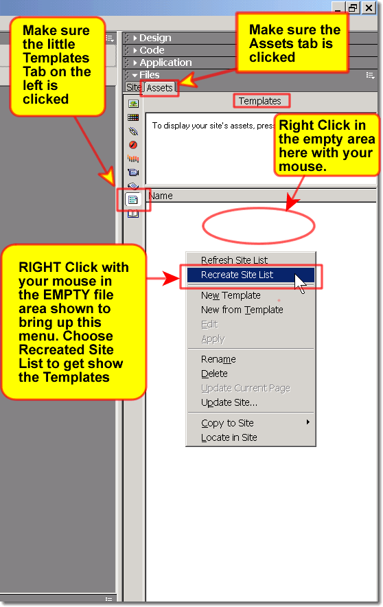 Sometimes Dreamweaver doesn't lists all of the templates in the Assets Tab. Below is a way to recreate this site list.